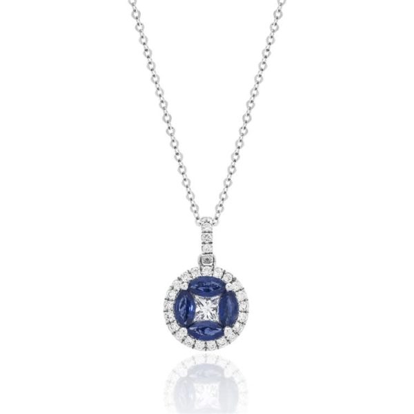 Center diamonds and four marquise blue sapphires are surrounded by a halo of diamonds in this beautiful pendant for everyday wear. Includes 18″ adjustable cable chain.